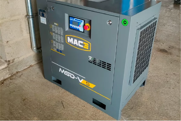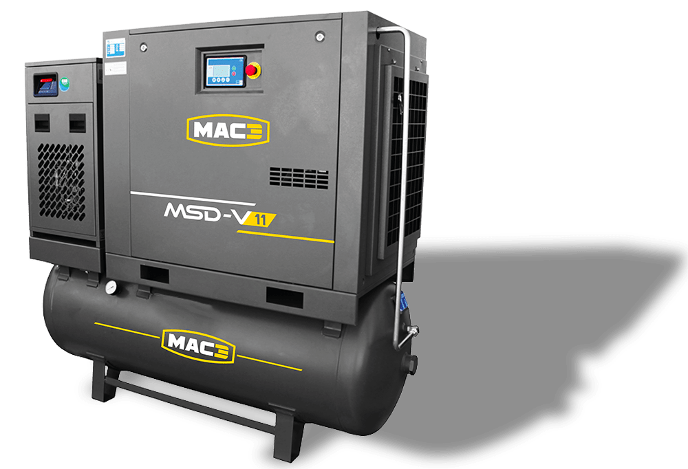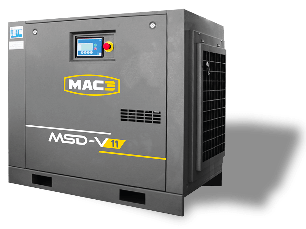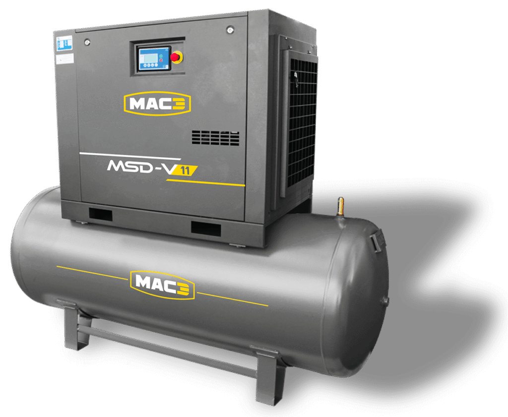 The MAC3 MSD-V range of variable speed industrial compressors (5 to 15 kW) delivers optimized air solutions designed for your operational needs. Whether you choose a frame-mounted unit, a tank-mounted system, or our all-in-one compact solution (compressor + tank + dryer), you benefit from exceptional: